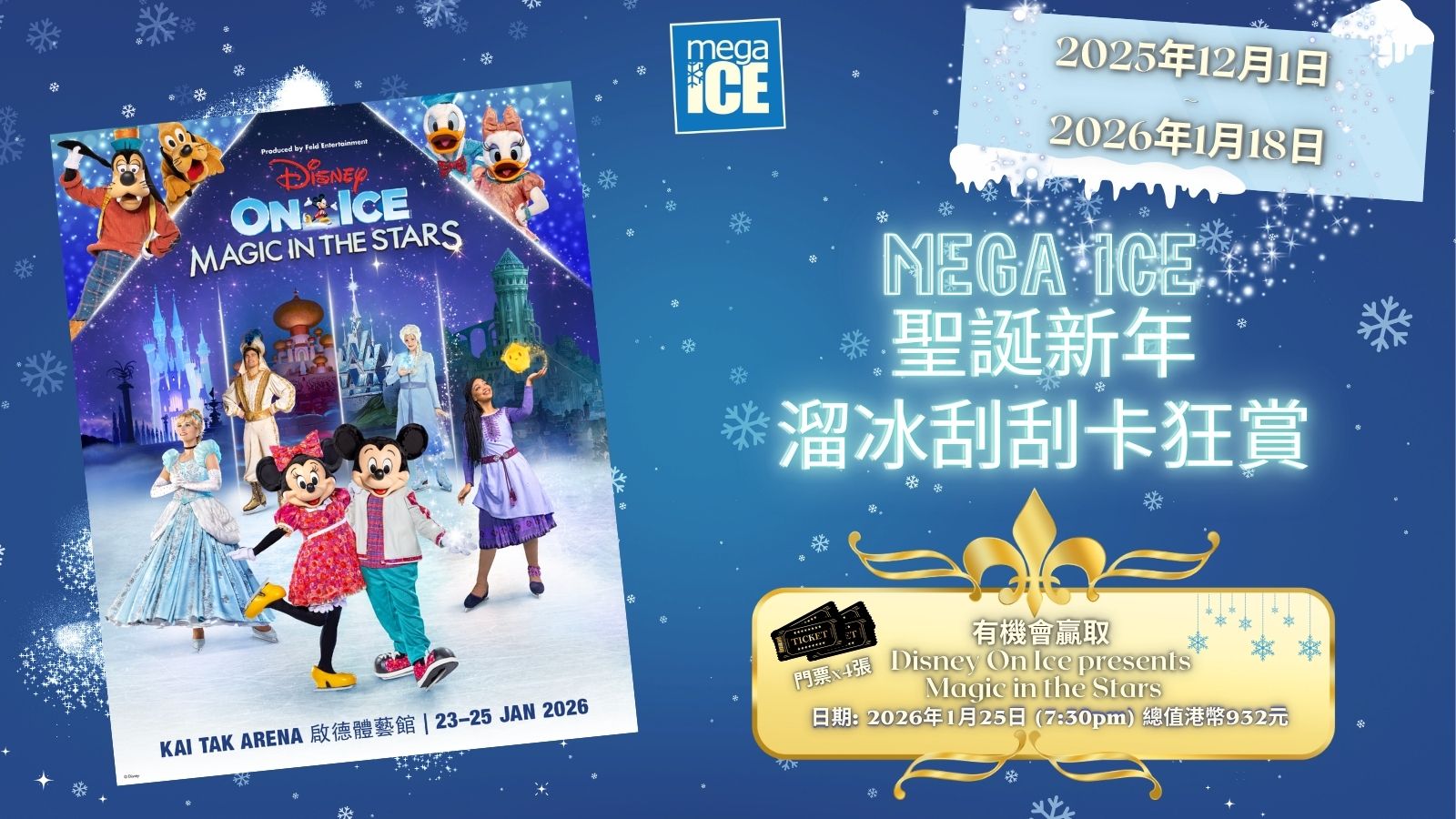 獎品A︰Disney On Ice presents Magic in the Stars 門票 四張 價值︰932 港元 (15名) 日期: 2026年1月25日 (晚上7時半) -